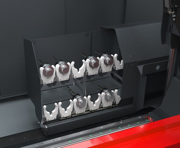 5-axis CNC machining centre used for the working of bars or aluminium, PVC, light alloys in general and steel pieces. It is provided with two operating modes: a single work area for bars up to 7 m length or two independent work areas in swing mode. The machine in HP version is equipped with 2 additional axes for positioning of vices and reference stops, that allow positioning the vices while the machine is working in swing mode. The 4th and 5th axis allow the electric spindle to continuously rotate to NC from -15° to +90° on horizontal axis and from -360° to +360° on continuous vertical axis, to perform the work on the upper side and on all the lateral sides of the profile. It is provided with a 12-place tools magazine, on the X axis gantry, able to host also one milling disc. It also has a mobile work surface that facilitates the piece loading/unloading operation and significantly increases the workable section.