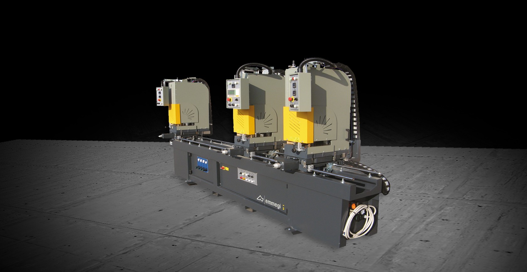 Automatic in-line 3-head welding machine for right angle corners and also corners in the range 30° to 180°, T, H and cross welding. FUSION 3 TVH comes in 2 working lengths (3440 and 4440 mm) and offers the possibility of welding up to 2 frames simultaneously with 1 or more heads. FUSION 3 TVH is provided with heated welding bead restrictors adjustable in the confi guration phase, in a range from 0.5 to 2 mm; it also has vertical vices running on linear slideways. Depth of fusion can be set at 2.5 or 3 mm while the support arms feature adjustable height. FUSION 3 TVH can be fi tted with counterblocks (optional) and can handle all types of standard profi les (including acrylic and coated) as well as large profi les (solid profi les). The machine, provided with a quick change system, allows easy cleaning of the tefl on fi lm. The work cycle is controlled by a PLC while the heating plate has a digital temperature controller (settable in both °C and °F); the heating time can be set via the LCD display.