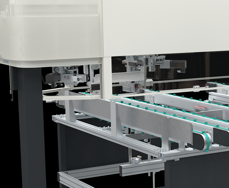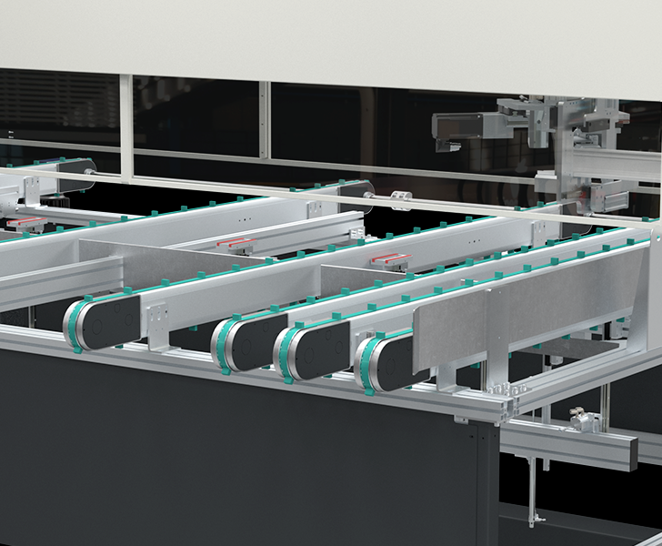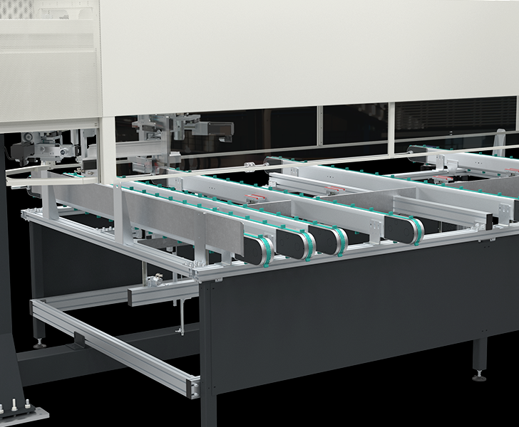 Il piano di carico e scarico a cinghioli permette la movimentazione di profili in PVC in modo sicuro, semplice ed ergonomico. Il piano è dotato di sistema automatico di sollevamento e posizionamento a misura del profilo per la corretta lavorazione delle due testate.