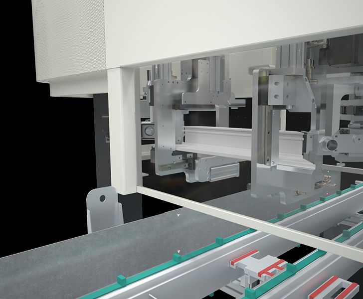 Due unità di fresatura, di cui una a sinistra fissa ed una a destra mobile su asse X, agiscono contemporaneamente sulle due estremità del profilo, asportando il materiale necessario per la corretta applicazione della tecnologia Seamless. Le due unità operano su due assi CNC, per la lavorazione del profilo pretagliato a 45°. Un quinto asse CNC posiziona la testata mobile in riferimento alla lunghezza del segmento in lavorazione.