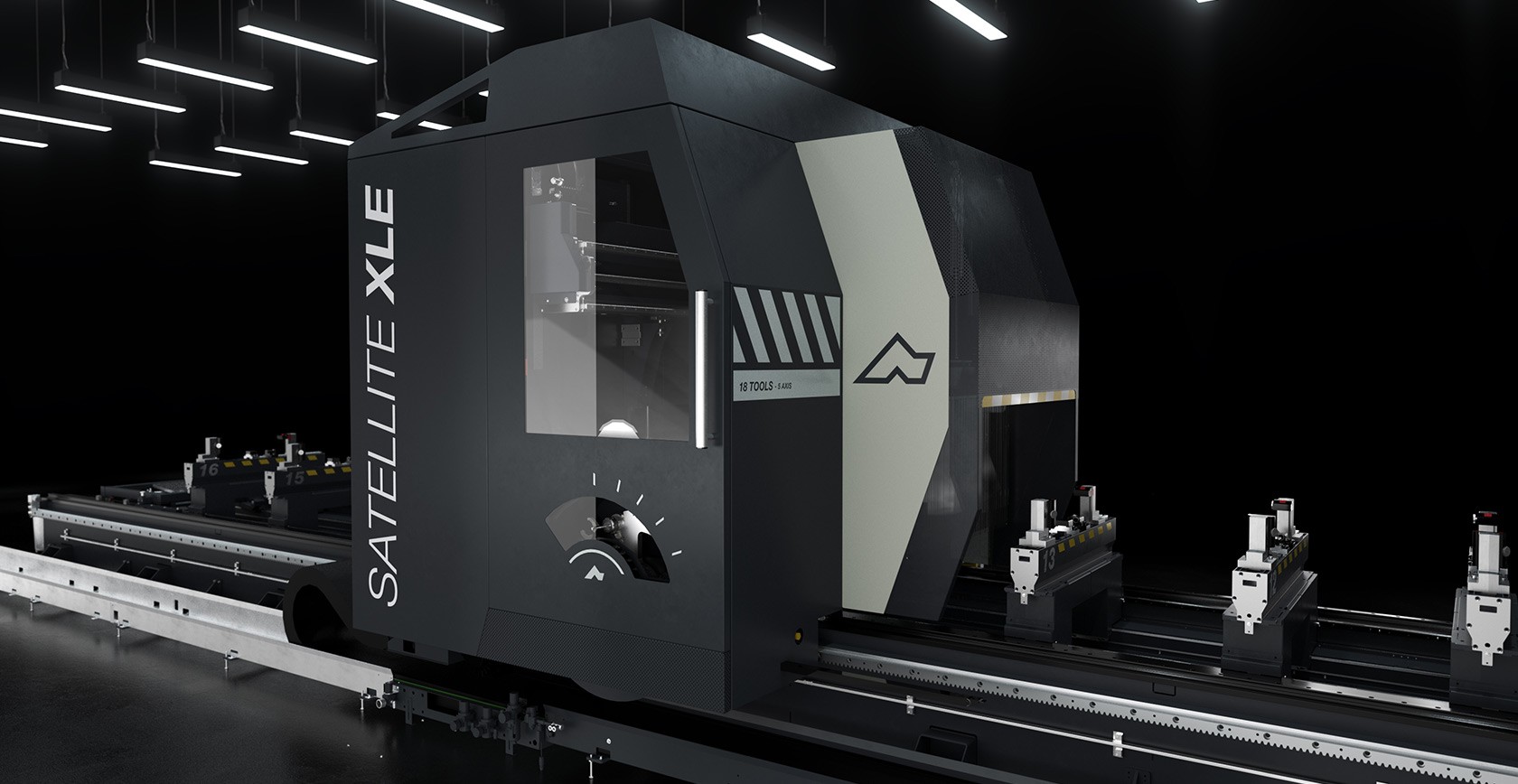 5-осевой обрабатывающий центр с ЧПУ и подвижным порталом, предназначен для осуществления фрезерования, сверления, нарезания резьбы и резки крупных профилей из алюминия, ПВХ, легких сплавов и стали. Подвижная часть станка состоит из портала, оснащенного приводом с высокоточной зубчатой рейкой. Электрошпиндель с повышенной мощностью (11 кВт в режиме S1) с креплением инструментов HSK-63F позволяет выполнять обработку, в том числе в тяжелых условиях, с высокой скоростью и безукоризненной точностью. Конструкция новой кабины локальной защиты сочетает в себе максимальную функциональность, доступность и освещенность в соответствии с требованиями по безопасности и эргономике. Крупные застекленные поверхности позволяют оператору контролировать выполнение обработки и, благодаря системе, позволяющей полностью открыть кабину на две отдельные части, упрощается доступ при осуществлении очистки и техобслуживания. Внутри расположен магазин инструментов на 18 мест. Режущий диск диам. 450 мм расположен отдельно в специальном магазине. SATELLITE XLE оснащен новыми моторизованными зажимами, которые, работая в маятниковом режиме, независимо и одновременно позиционируются согласно процессам обработки шпинделя в противоположном рабочем поле. Прочные и компактные зажимы легко конфигурируются без использования инструментов для геометрической регулировки. Новые упоры позволяют полностью охватить рабочую зону и освобождают всю область в случае обработки на головках профиля. Все оси ЧПУ являются абсолютными и не требуют обнуления при повторном запуске станка.